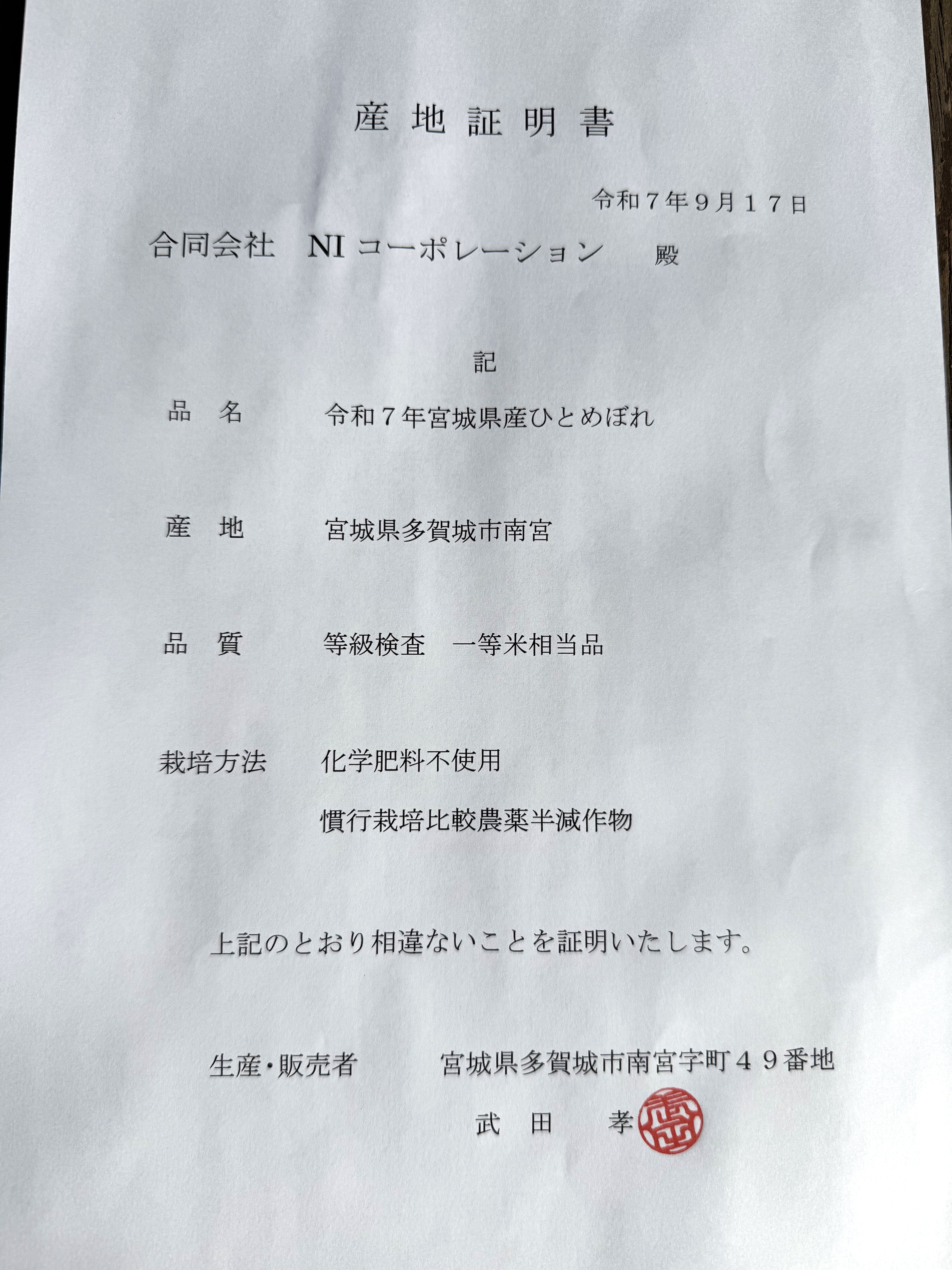 ・産地証明書付き:多賀城市産であることを証明する書類を同封